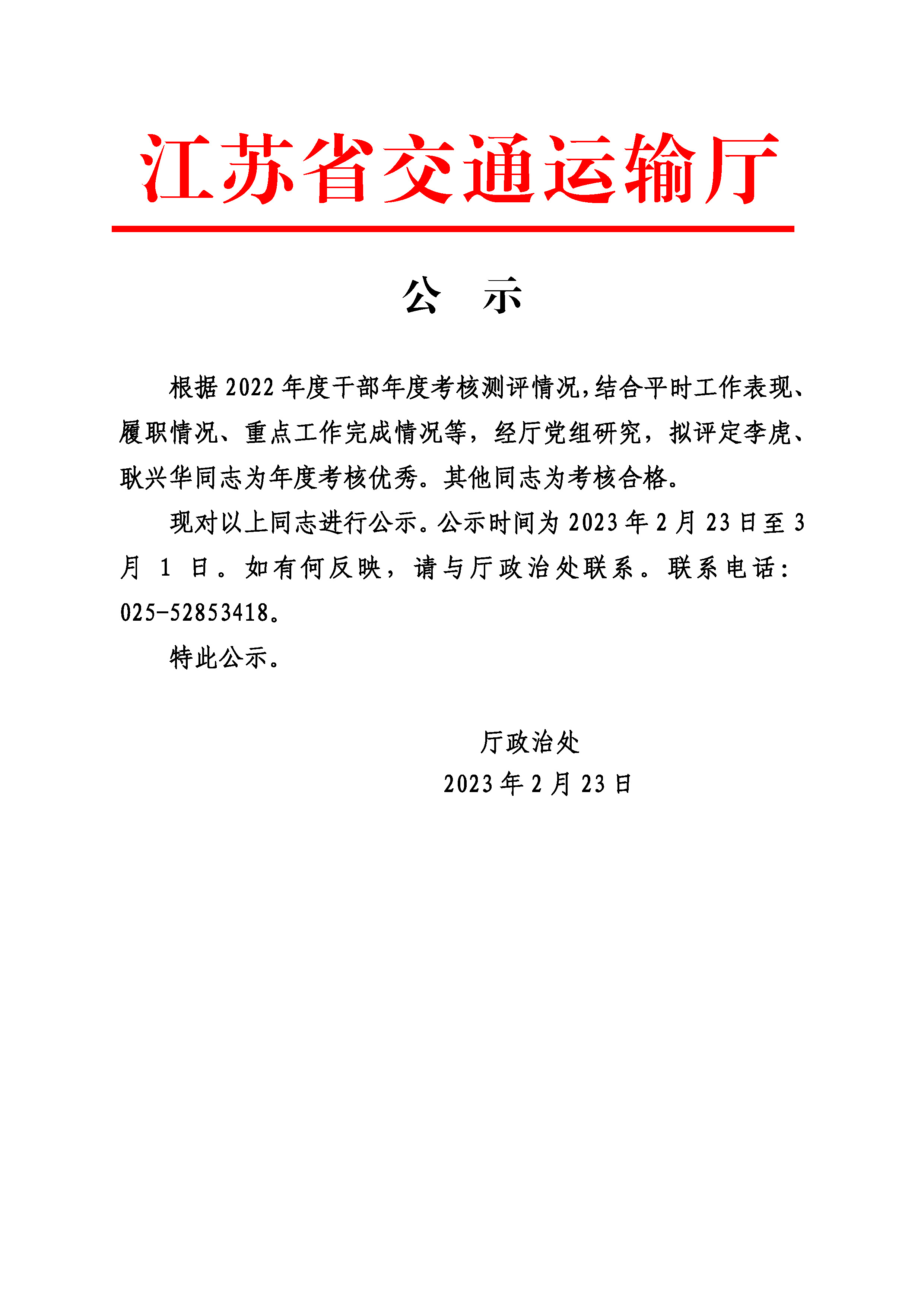 2022年度考核优秀等次人员名单公示