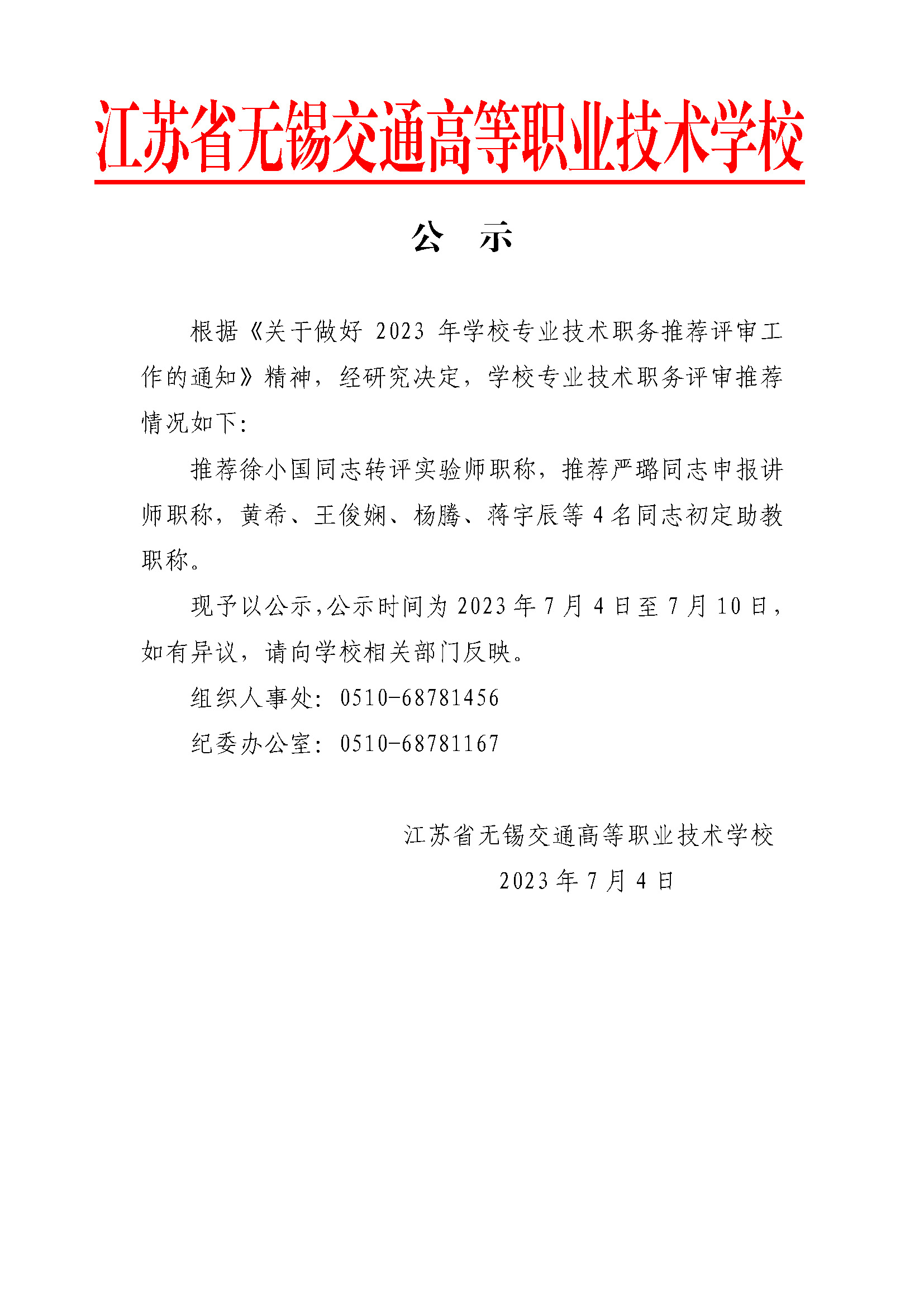 2023年学校专业技术资格评审推荐情况公示